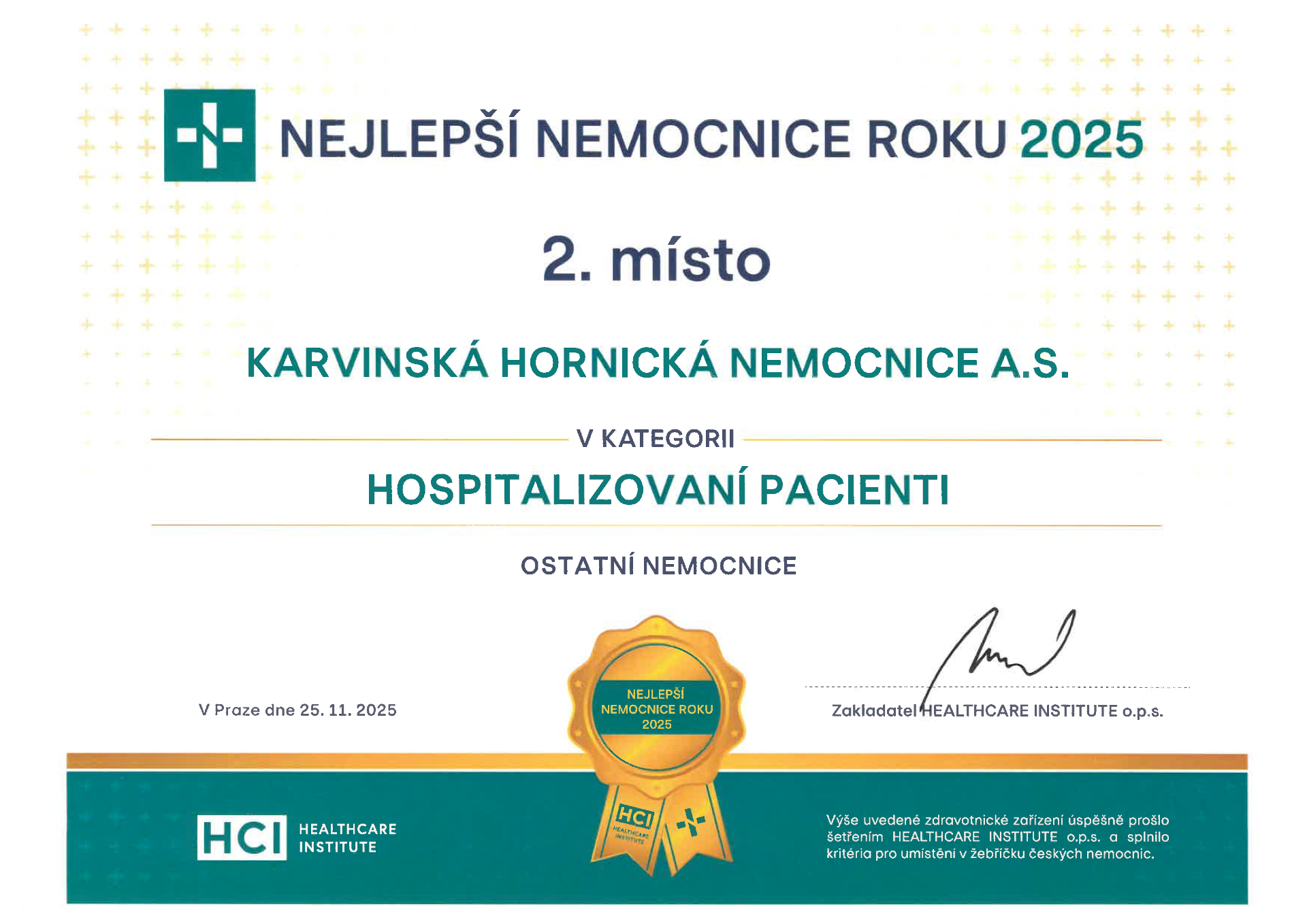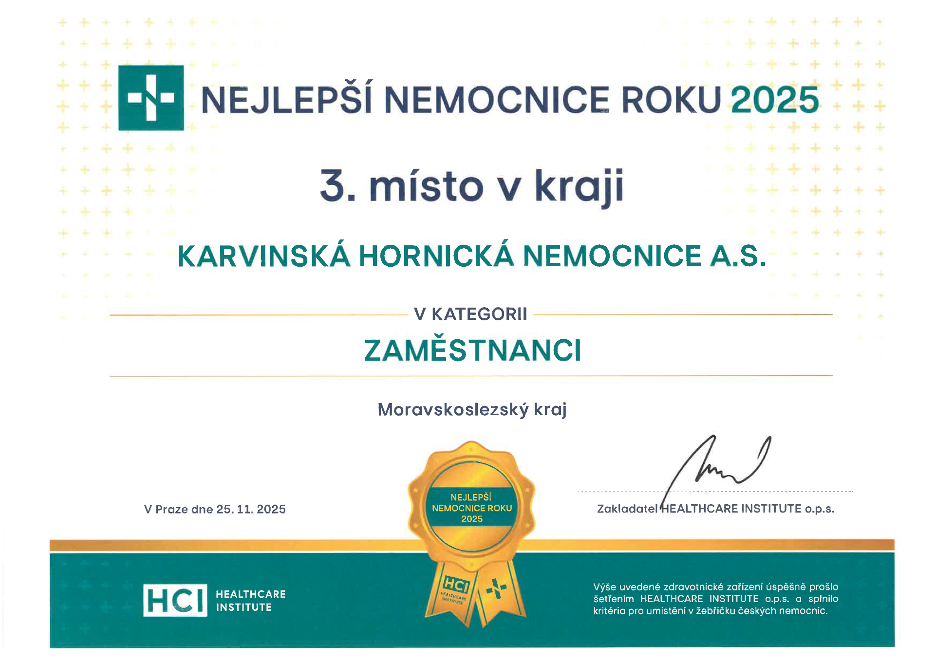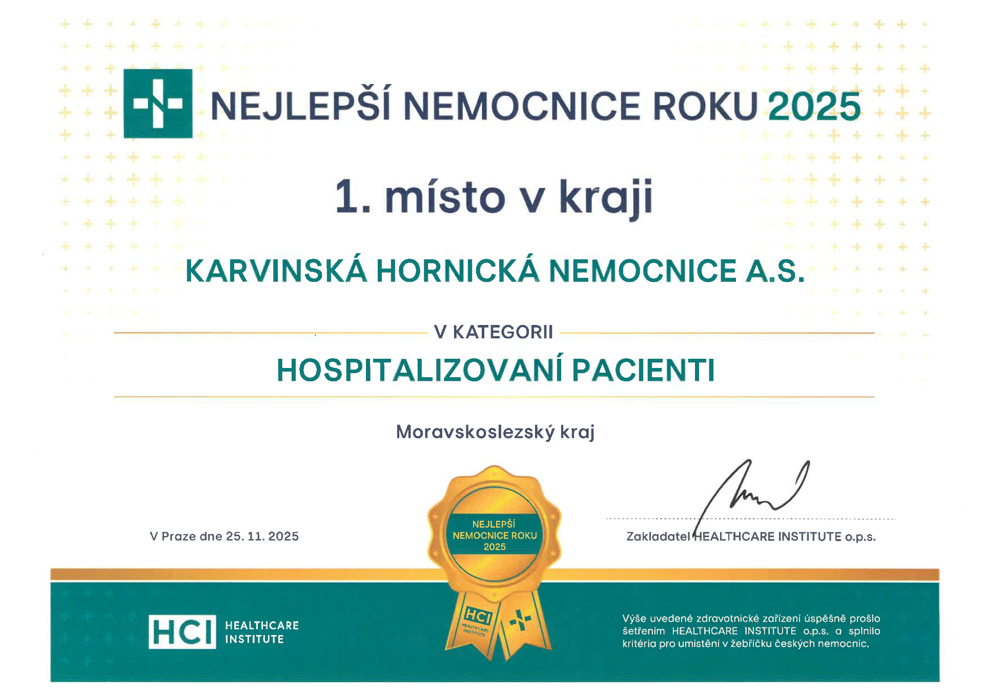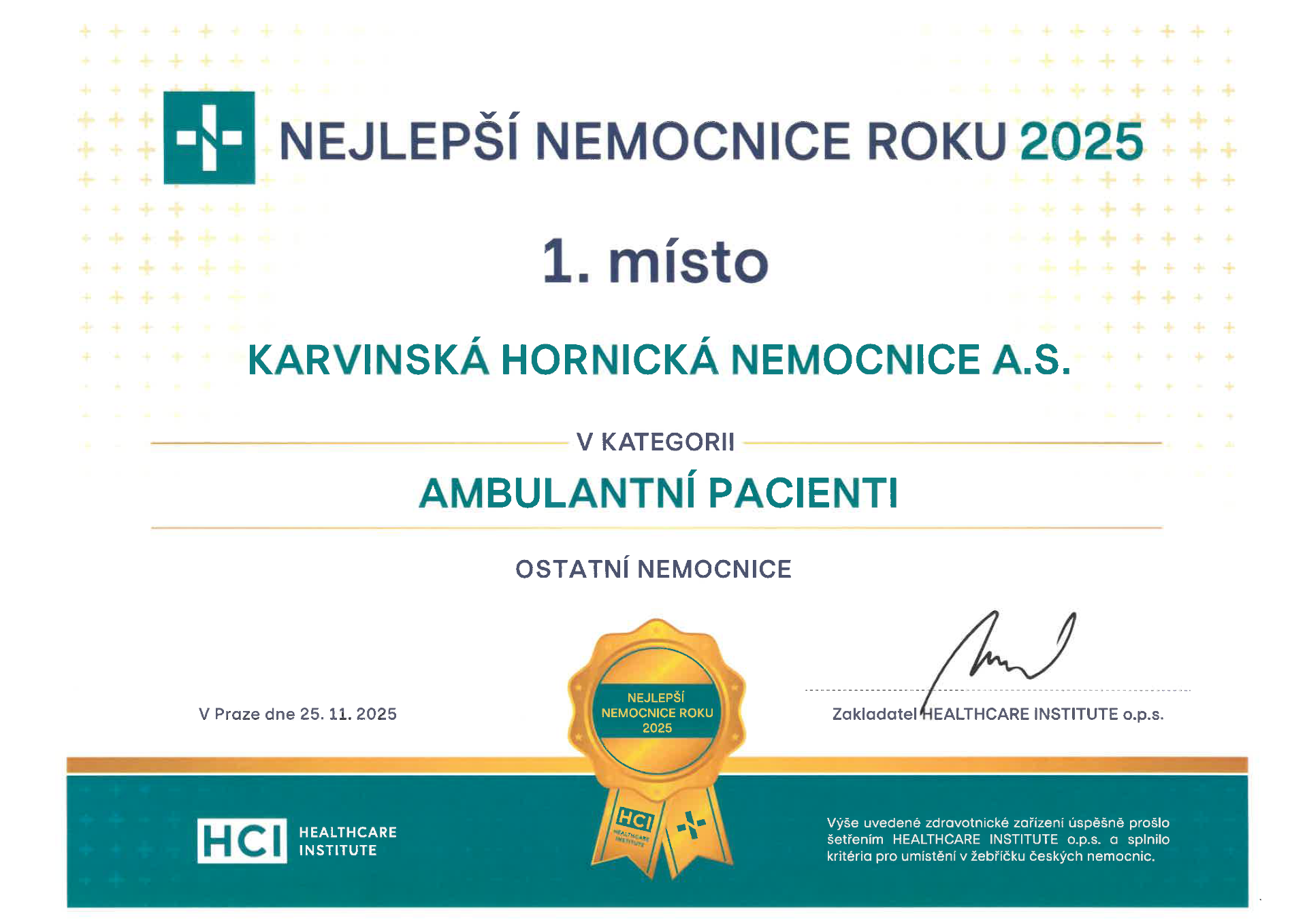 Ráda bych touto cestou vyjádřila upřímné poděkování celému týmu Chirurgického oddělení Karvinské hornické nemocnice pod vedením primáře MUDr. Tomaly, kde jsem podstoupila operaci křečových žil. Velké díky patří nejen panu primáři a lékařům, ale i všem sestřičkám a personálu oddělení za jejich profesionalitu, lidský přístup, ochotu a péči, kterou mi po celou dobu pobytu věnovali. Zároveň bych chtěla poděkovat také kolektivu na operačním sále za jejich skvělou práci, klidný přístup a příjemnou atmosféru, která pomohla překonat přirozený strach z operace. Karvinská hornická nemocnice se právem umisťuje na předních příčkách v České republice a v Moravskoslezském kraji patří k těm nejlepším zdravotnickým zařízením – a já se po své zkušenosti mohu s radostí připojit k těm, kdo to potvrzují. Ještě jednou děkuji všem za péči a lidskost. M.W.