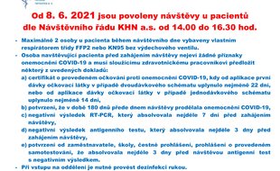 Od úterý 8. června 2021 jsou povoleny návštěvy u všech hospitalizovaných pacientů dle Návštěvního řádu Karvinské hornické nemocnice a.s. Své blízké můžete navštěvovat denně od 14 do 16:30 hodin, přičemž je nutné dodržovat tato opatření: