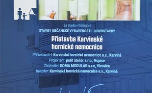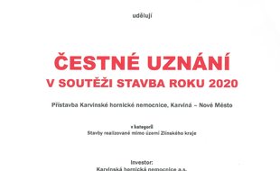 V prestižní soutěži Stavba Moravskoslezského kraje byly včera oceněny nejlepší stavby v regionu za rok 2020. Modulární přístavba naší nemocnice získala od odborné poroty čestné uznání v kategorii novostaveb občanské vybavenosti. V kategorii, ve které soutěžilo 30 novostaveb, se tak zařadila mezi tři oceněné.