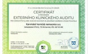 V červnu provedli nezávislí auditoři externí klinický audit na radiodiagnostickém oddělení Karvinské hornické nemocnice s cílem ověřit a zhodnotit dodržování místních a národních radiologických standardů při poskytování zdravotních služeb, jejichž součástí je lékařské ozáření. RTG oddělení úspěšně zvládlo náročné podmínky takové kontroly a získalo osvědčení o auditu na 5 let.