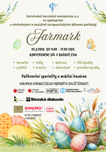 Srdečně zveme návštěvníky naší nemocnice k návštěvě velikonočního jarmarku, v konferenčním sále dne 25.3.2026 od 9:00 do 17:00 hod.