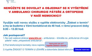 Nemůžete se dovolat do naší ortopedické ambulance v nemocnici nebo do ambulance chirurgie páteře? Využijte naši novou službu „Žádost o termín“ u lékaře. Prostřednictvím elektronického formuláře na našich webových stránkách nám sdělte své identifikační a kontaktní údaje a my vás do 48 hodin budeme kontaktovat s možným termínem. Ozveme vám e-mailem v naší pracovní době od 8 do 13:30 hodin.
