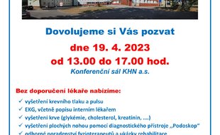 Karvinská hornická nemocnice a.s. zve širokou veřejnost na DEN ZDRAVÍ, který se koná ve středu 19. dubna 2023 v Konferenčním sálu nemocnice. V čase od 13 do 17 hodin budou návštěvníkům k dispozici naši zdravotníci.
